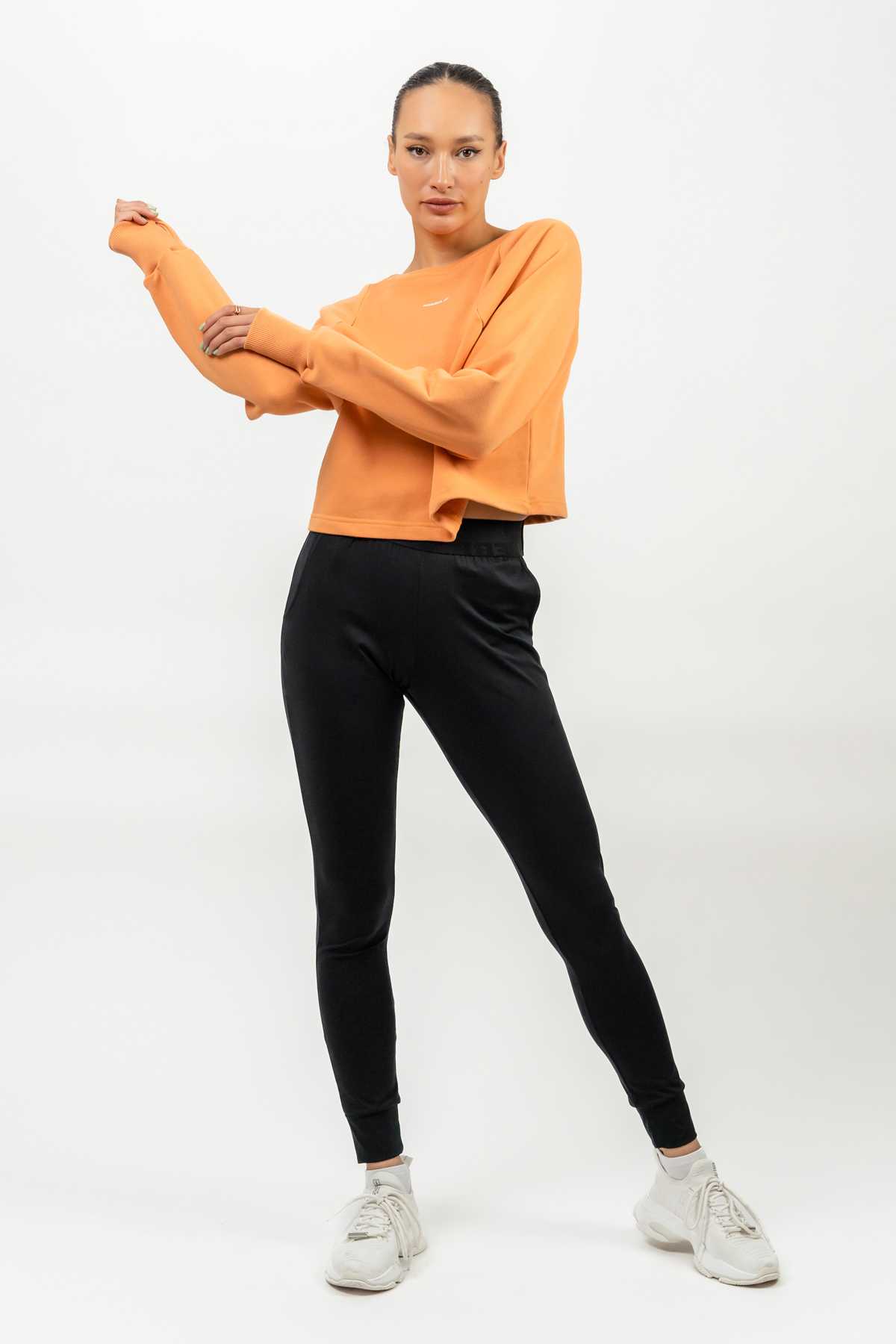 A stylish cropped sweatshirt that will make you feel extremely comfortable. And not only because it is made of a pleasant cotton material. It is breathable and soft and gives you freedom in each motion you make. Thanks to the elasticated ribbings and thumbholes, you can be sure that the sleeves will stay firmly in place without the need for constant adjustments.
