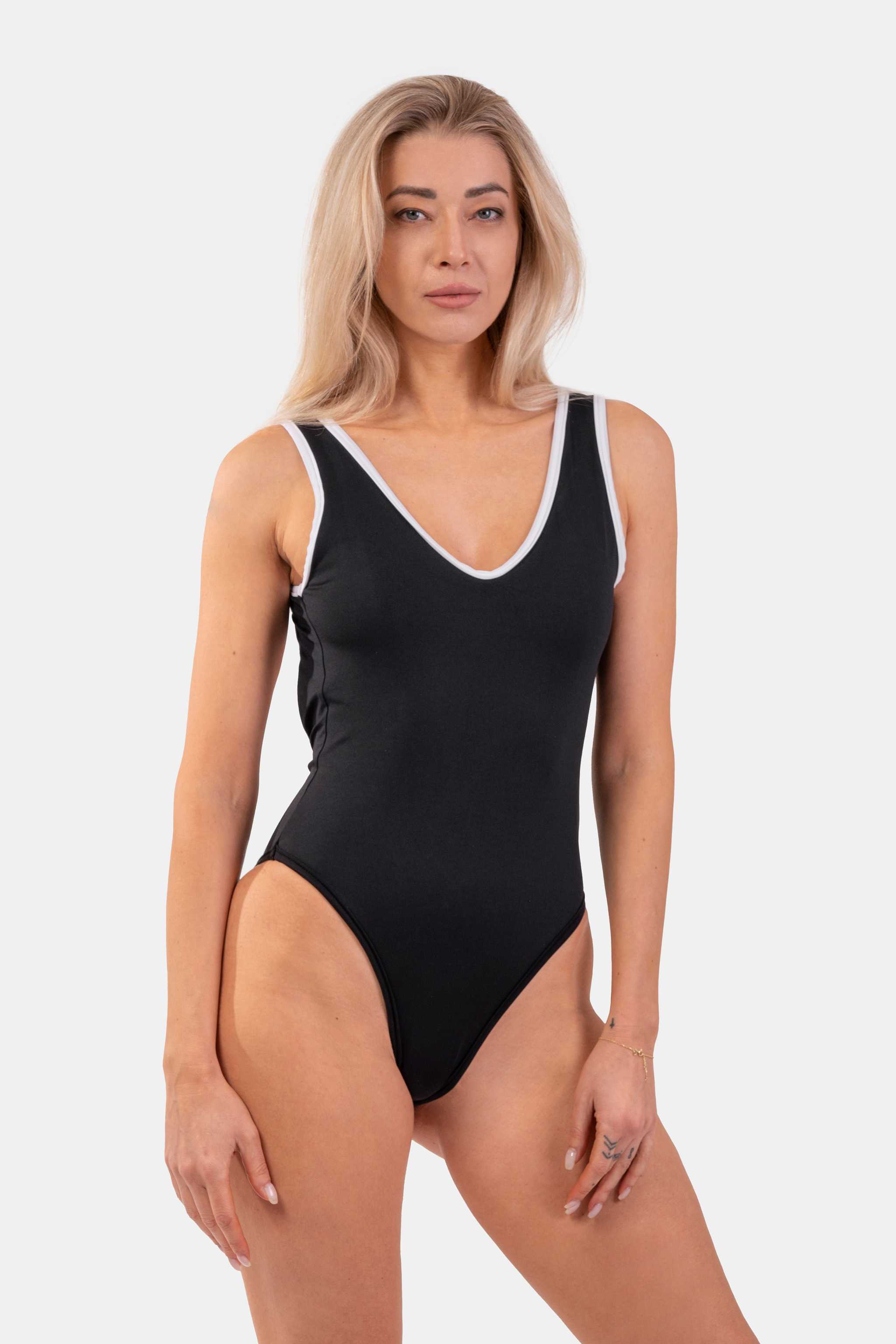 The One-piece Swimsuit French Style in black will charm you with their minimalistic design and detailing. The straps have a white hem that create an intriguing detailing in the back together with the metal NEBBIA logo. The swimsuit provides full coverage in the front part, and in the back there’s the eye-catching deep cut. The Scrunch-Butt Effect will highlight your curves and you’ll feel even more confident than before. Enjoy your summer to the fullest in the French Style Black Swimsuit! Fun will never be out of fashion!